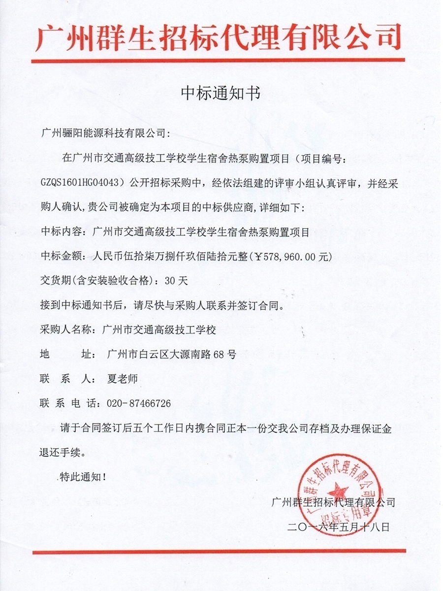 廣州市交通高級技工學校學生宿舍熱泵購置項目